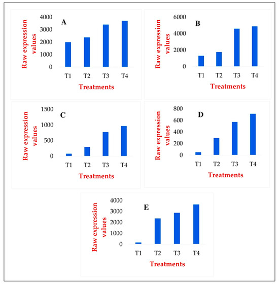 Genes that were down-regulated, up-regulated, under-represented, or over-represented—indicating significant deviations from the average—were selected from the expressed sequences of the treated samples by comparing de novo blast, mapping, and annotation of transcriptome data [27]. The chosen genes, which showed considerable variations across treatments, were grouped by their molecular roles. This helped us better understand how treatments affect biochemical functions [28]. A comprehensive pathway analysis of the Plant Reactome [29] and KEGG [30] databases was conducted to identify biochemical pathways that responded positively or negatively to the treatments.