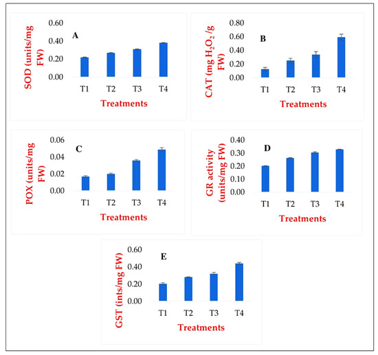 Changes in the activities of the main antioxidant enzymes: SOD (A), CAT (B), POX (C), GR (D), GST (E), as a result of the treatments, expressed as gene expression levels based on in silico analyses. T1: Ctrl_non_stressed. T2: Ctrl_stressed. T3: GABA_non_stressed. T4: GABA_stressed.
