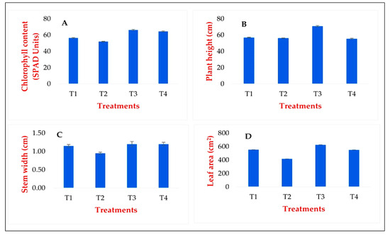 The chlorophyll content was determined using a (SPAD) 502 Plus device manufactured by Konica Minolta (Osaka, Japan), and the measurements were taken every 10 days with the growth attributive recordings; plant height, stem diameter, and the leaf surface are according to the protocol by Ahmed et al. (2024) [38].