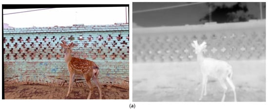 To visually demonstrate the superiority of this algorithm in different scenarios, as shown in Figure 9, two sets of infrared-visible image data with different difficulties will be selected from the dataset. One set consists of a single sika deer, while the other comprises a herd of sika deer.