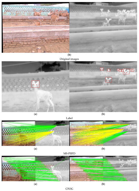 In order to verify the superiority of ID-APM in finding the ROI of animals in infrared thermal images, it will be compared with different types of methods [22,23]. Our selection strategy was twofold: since ID-APM is primarily based on traditional computational principles, we first compared it against leading traditional algorithms, including feature-based (MS-PIIFD, MS-HLMO, POS-GIFT) and area-based (CFOG) approaches. To provide a more comprehensive comparison against the current state of the art, we also included several powerful deep learning-based methods (DISK, ReDFeat, and XoFTR). This diverse benchmark allows for a rigorous assessment of our method’s performance against both its peers and leading deep learning paradigms.