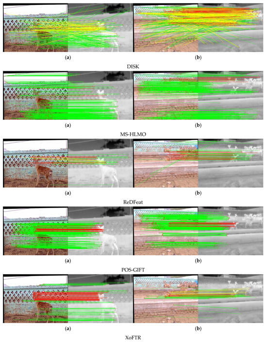 The mapping relationships between visible and infrared images under different methods are visually presented in Figure 9. The selected baseline methods represent three distinct categories: feature-based matching (FBMs) including MS-PIIFD, MS-HLMO, and POS-GIFT; the area-based method (ABM) CFOG; and learning-based methods, ReDFeat, DISK and XoFTR.