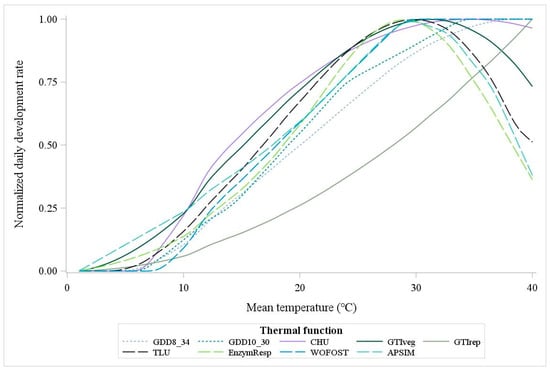 The thermal functions used in this study can be classified into three main categories: empirical linear functions, empirical nonlinear functions, and process-based functions. Empirical functions are typically derived through statistical analysis of actual data and describe the relationships between variables. Such functions may be developed on the basis of field data. In this study, the empirical thermal functions used can be further categorized into linear and nonlinear functions. By contrast, process-based functions are developed on the basis of physical or physiological mechanisms and explicitly describe causal relationships between variables [33]. This study also includes functions based on protein activity. GDD10,30 and GDD8,34 are empirical linear functions. CHU and GTI are empirical nonlinear functions. TLU, APSIM, WOFOST, and EnzymResp are process-based functions. These thermal functions are described in the following.