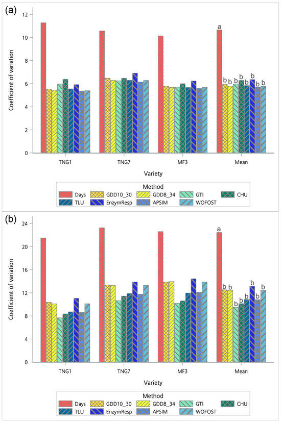 Bar charts showing the coefficients of variation of cumulative effective temperature during the growth period for each variety and method (Days, GDD10,30, GDD8,34, GTI, CHU, TLU, EnzymResp, APSIM, and WOFOST): (a) before flowering stage (from planting to flowering), with a total sample size of 73 per variety; and (b) after flowering stage (from flowering to maturity), with a total sample size of 60 per variety. Means followed by different letters indicate significant differences at the 0.05 probability level, as determined using Hochberg’s GT2 test.