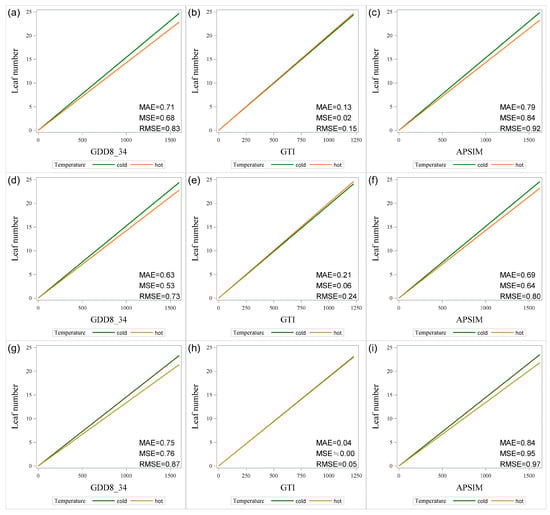 Relationship between leaf number and cumulative temperature for each variety, where predictions were obtained using (a) GDD8,34, (b) GTI, and (c) APSIM for TNG1; (d) GDD8,34, (e) GTI, and (f) APSIM for TNG7; (g) GDD8,34, (h) GTI, and (i) APSIM for MF3. The orange and green lines represent data from the before flowering stage (from planting to flowering) under high temperature and the growing season under low temperature, respectively. MSE, RMSE, and MAE values indicating performance of leaf number predictions obtained using three thermal functions (GDD8,34, GTI, and APSIM) for three varieties when considering planting to flowering phenological stages.