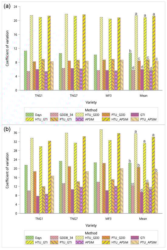 By variety, TNG7 showed the largest CVs in the before-flowering stage (6.85), whereas MF3 showed the largest CVs in the after-flowering stage (13.73). Varieties with longer growth durations (TNG7 and MF3) tended to have higher CVs than the early-maturing TNG1, suggesting that prediction stability may differ between short- and long-cycle varieties. Although Figure 2 does not allow direct statistical comparisons within each variety, the varietal patterns mirrored the overall averages. This reflects the differences among methods were consistent within the variety. In addition, when the thermal functions were classified into empirical linear, empirical nonlinear, and process-based functions, the average CVs for the before flowering stage were found to be ranked as follows: calendar days method > empirical nonlinear functions > process-based functions > empirical linear functions (Figure 2a). For the after-flowering stage, the ranking was calendar days method > empirical linear functions > process-based functions > empirical nonlinear functions (Figure 2b). Among thermal functions, APSIM performed best before flowering (5.70), whereas GTI was most stable after flowering (9.50). However, across both stages, GTI had the lowest overall average CV (7.74).