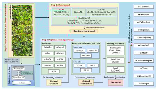To achieve tea plant variety identification based on canopy images during the harvest period, the technical workflow of this study was designed as outlined in Figure 1, which consisted of three main steps. Step 1: Dataset construction. Canopy images of tea plants were collected in the field during the harvest period under varying seasons, lighting conditions, shooting angles, and distances to enhance the generalizability of the proposed method. The tea plant variety identification dataset was constructed based on these images, which served as the foundation for model training and performance evaluation. Step 2: Baseline network model selection. To identify a suitable deep learning framework, 14 convolutional neural networks with varying sizes and structural complexities were evaluated. Each network was trained using transfer learning, and these models were compared to determine the baseline network with the best identification performance. Step 3: Training strategy optimization. The effects of different optimizers, input image sizes, dataset split ratios, and training parameter combinations on model performance were analyzed using the leave-one-out method. The optimal training strategy was determined to improve the identification performance of the baseline network model.