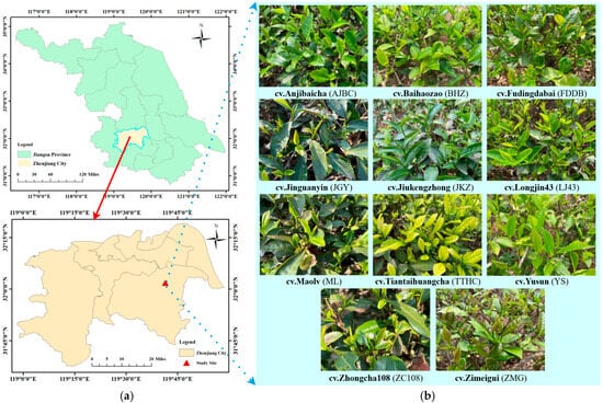 Experimental site and selected tea plant variety. (a) and (b) represent the experimental site and the selected tea plant variety, respectively.