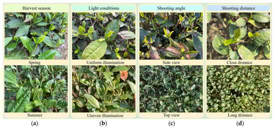 Tea plant canopy image samples under different conditions. (a–d) represent the canopy image samples captured under different seasons, light conditions, shooting angles, and distances.