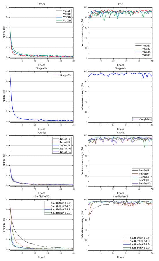 To develop a high-performance model for identifying tea plant varieties based on canopy images during the harvest period, this study fine-tuned different CNNs using transfer learning methods. A total of 14 CNN architectures were selected, including VGG (VGG11, VGG13, VGG16, VGG19), GoogleNet, ResNet (ResNet18, ResNet34, ResNet50, ResNet101, ResNet152), ShuffleNetV2 (ShuffleNetV2-0.5×, ShuffleNetV2-1.0×, ShuffleNetV2-1.5×, ShuffleNetV2-2.0×). During training, the input image size was resized to 416 × 416, the training and validation sets were randomly split at a ratio of 80:20. The AdamW optimizer was employed with a batch size of 4, 50 epochs, and an initial learning rate of 0.0001. The training process of the different models is shown in Figure 4. Most models exhibited a gradual decrease in training loss and achieved convergence. An exception was ShuffleNetV2-0.5×, whose loss continued to decline at the 50th epoch, likely due to its relatively simple network structure requiring additional iterations to fully fit the training data. Benefiting from transfer learning, the validation accuracy of all models increased rapidly during the initial epochs and subsequently stabilized with minor fluctuations, demonstrating the effectiveness of leveraging pre-trained weights for this task.