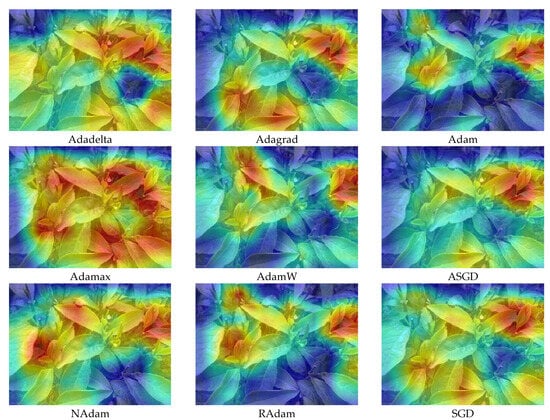 In this study, the performance of models trained with 9 optimizers was compared, including Adadelta, Adagrad, Adam, Adamax, AdamW, ASGD, NAdam, RAdam, and SGD (Table 3). Among these, Adamax achieved the best identification performance, with an accuracy of 98.03%, whereas Adadelta yielded the worst identification performance, with an accuracy of 85.61%. During the harvest period, tea shoot morphology varies due to differences in light conditions, nutritional status, and shooting angles. Consequently, canopy images of different tea plant varieties may exhibit similar features, which can cause gradient oscillations during training when using optimizers with simple update rules, such as Adadelta and SGD. This prevents the model from converging to an optimal solution. Adamax is a variant of Adam based on the infinity norm, simplifying the upper bound of the learning rate and enabling the model to capture the maximum gradient component during training. This mechanism allows it to better learn fine-grained differences between visually similar varieties. The regions of interest for different models were visualized using the gradient-weighted class activation mapping method [] (Figure 5). Heatmaps showed that all models primarily focused on tea shoot regions while paying less attention to the background elements, such as older leaves and stems. Notably, the Adamax-trained model exhibited the broadest attention distribution and highest intensity, reflecting its superior capability to extract discriminative features for variety classification. Therefore, Adamax was selected as the optimal optimizer. Replacing AdamW with Adamax in ResNet50 increased identification accuracy from 97.12% to 98.03%, representing a 0.91% improvement.