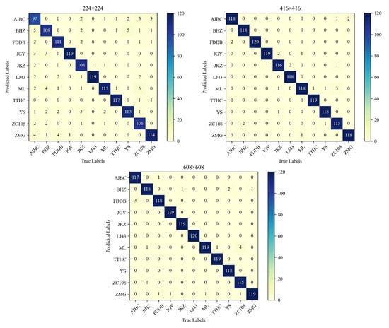 CNNs hierarchically extract image features, progressively downsampling the input data. Therefore, when developing deep learning–based classification models, it is essential to evaluate the effects of input image size and dataset split ratio on training outcomes. Based on the above results, Adamax was adopted to dynamically adjust model parameters during training. To determine the optimal combination of input image size and dataset split ratio, this study conducted a comparative analysis of three input image sizes (224 × 224, 416 × 416, 608 × 608) and three dataset splitting ratios (training set and validation set splitting ratios of 70:30, 80:20, 90:10) on training outcomes (Table 4). Figure 6 illustrates the confusion matrices for models trained with different input sizes when the training and validation sets are split at a ratio of 70:30. When smaller images are used, the model receives limited fine-grained information, making it difficult to distinguish tea plant varieties with high phenotypic similarity. Increasing the input size allows the model to capture more discriminative features during training, thereby improving classification accuracy. However, higher-resolution images also increase computational demands and reduce real-time inference speed. For example, the FLOPs and FPS changed from 4.13 G and 76.81 at 224 × 224 to 30.44 G and 37.90 at 608 × 608.