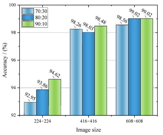 A well-chosen dataset split ratio is critical for balancing model training and validation. The training set must contain sufficient samples to enable the network to learn key discriminative features effectively, while the validation set provides an unbiased estimate of generalization performance and helps prevent overfitting []. In this study, the impact of different training-validation split ratios on identification performance was evaluated across multiple input image sizes. The results revealed that the model’s accuracy varied with the split ratio, reflecting the trade-off between the quantity of training data and the reliability of validation feedback (Figure 7).