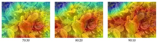 When the input size was 224 × 224, accuracy consistently improved as the proportion of training data increased, increasing from 92.95% to 94.62%. This trend likely reflects the limited fine-grained information in smaller images, which necessitates a larger training set to capture sufficient details for accurate classification. With more training samples, the model was able to learn a richer set of discriminative features for variety identification (Figure 8). For input images of 416 × 416, accuracy initially decreased and then increased as the training set proportion grew. Specifically, accuracy decreased from 98.26% at a 70:30 split ratio to 98.03% at 80:20, before increasing to 98.48% at 90:10. This pattern may be attributed to the balance between training and validation data. With a split ratio of 70:30, the relatively large validation set could better reflect generalization performance and guide parameter tuning, partially offsetting the underfitting risk from fewer training samples. When the validation set became smaller at a split ratio of 80:20, the reduced feedback may have caused the model to converge to a local optimum. At a split ratio of 90:10, the larger training set enabled the model to learn more robust feature representations, improving accuracy. For an input size of 608 × 608, accuracy initially increased with a larger training set and then plateaued. Larger images inherently provide detailed visual features, and once a sufficient number of training samples is available, additional data has minimal impact on performance.