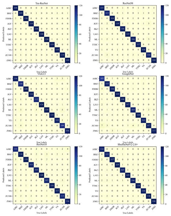 This study successfully achieved accurate identification of tea plant varieties based on canopy images during the harvest period using deep learning, with further performance improvements obtained through systematic training strategy optimization. Based on ResNet50 under the optimal training strategy, i.e., Adamax as the optimizer, input image size is 608 × 608, training set and validation split at a ratio of 80:20, learning rate is 0.0001, the batch size is 8, and 20 epochs, the model achieved an accuracy of 99.32%. This optimized model was named Tea-ResNet and compared with several models listed in Table 2 (Figure 9). The similarity among canopy images of different tea varieties, along with complex lighting and environmental backgrounds, is the main factor limiting the identification performance. For ResNet50, VGG13, GoogleNet, ResNet18, and ShuffleNetV2-2.0×, the varieties with the lowest identification performance in the test set were BHZ, ZC108, AJBC, AJBC, and AJBC, with correct identifications of 113, 109, 103, 111, and 114 samples, respectively. In contrast, Tea-ResNet accurately identified 118, 119, and 119 samples for AJBC, BHZ, and ZC108, respectively. Optimizing the training process enables the model to capture finer discriminative details between varieties, thereby reducing misidentification.