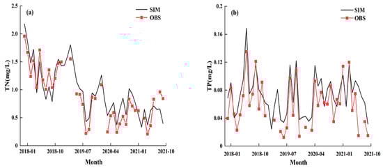 Comparison of simulated and measured values of TN (a) and TP (b) concentrations in the HYPE model.