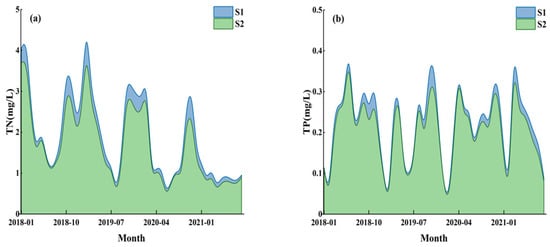 Comparison of dynamic changes in TN (a) and TP (b) concentrations at the basin outlet under crop rotation scenarios (S2) and baseline scenarios (S1).