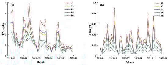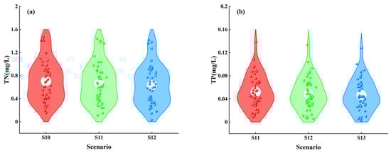 Dynamic changes of TN (a) and TP (b) concentrations at the basin outlet under comprehensive scenarios.