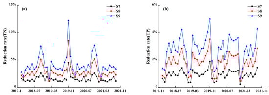Based on the “source–sink” landscape theory, this study systematically evaluated the regulatory effects of reforestation on nitrogen and phosphorus outputs in the watershed by setting landscape configuration scenarios with different forest cover rates (S7~S9). The simulation results showed that, compared with the baseline scenario (S1), all three landscape optimization scenarios effectively reduced TN and TP concentrations at the watershed outlet, with the reduction effect increasing as the forest proportion rose. As illustrated in Figure 5, among the three scenarios, the reduction rates of TN and TP exhibited a clear upward trend with increasing forest proportion, and the reduction effect was enhanced non-linearly with more forest cover. Compared with S1, the S9 scenario achieved a multi-year average reduction rate of 4.14% for TN and 2.78% for TP.