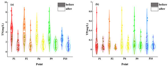 Changes in (a) TN and (b) TP concentrations before and after the implementation of green natural farming techniques at monitoring points (P1, P2, P4, P9, P10, Inc.). Note: P1, P2, P4, P9, and P10 are water quality monitoring points in the Chenzhuang village area, and data from these five points are relatively complete.