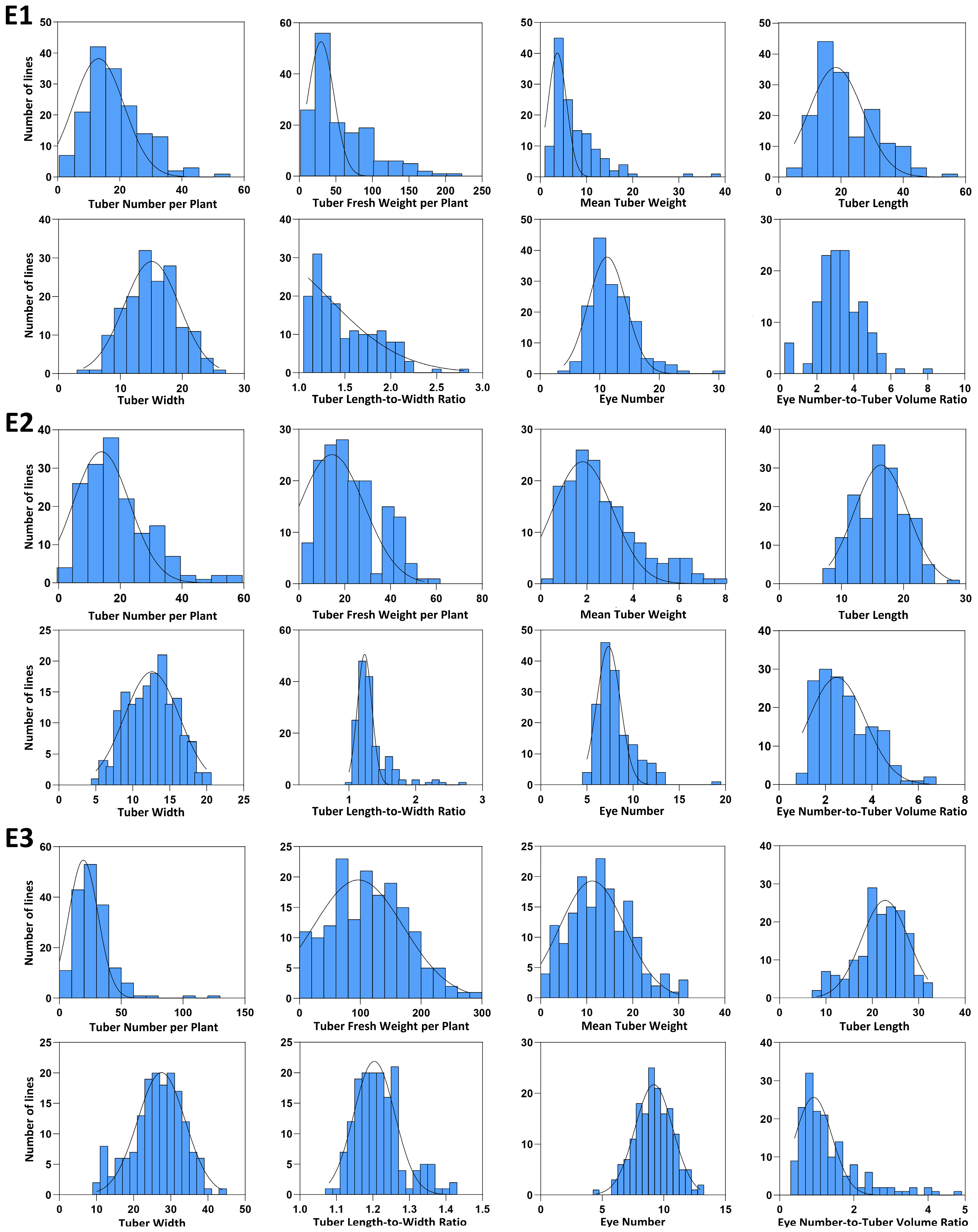 2 lines across three environments. These included three yield-related traits: Tuber Number per Plant (TNP), Tuber Fresh Weight per Plant (TFWP), and Mean Tuber Weight (MTW); three tuber-shape-related traits: Tuber Length (TL), Tuber Width (TW), and Tuber Length-to-Width Ratio (TLWR); and two eye-related traits: Tuber Eye Number (TEN) and Eye Number-to-Tuber Volume Ratio (ENTVR). Best linear unbiased estimates (BLUEs) were calculated for the eight traits based on phenotypic values across the three environments. The results revealed highly significant differences in all eight traits between the two parents and between the two F