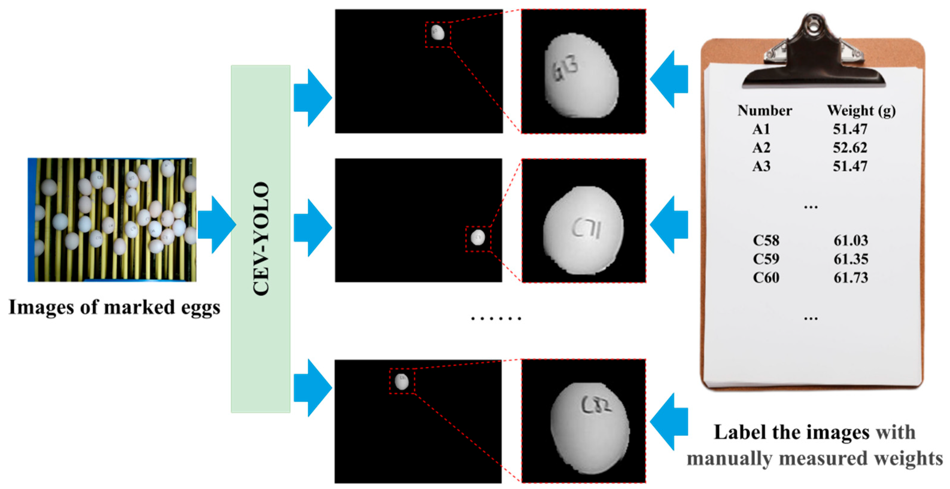 Construct a novel technical pipeline that combines image segmentation (CEV-YOLO + ByteTrack) and mask-based weight prediction (EWM-Net), which can process video data collected by customized devices to realize automated, high-precision egg weight measurement.