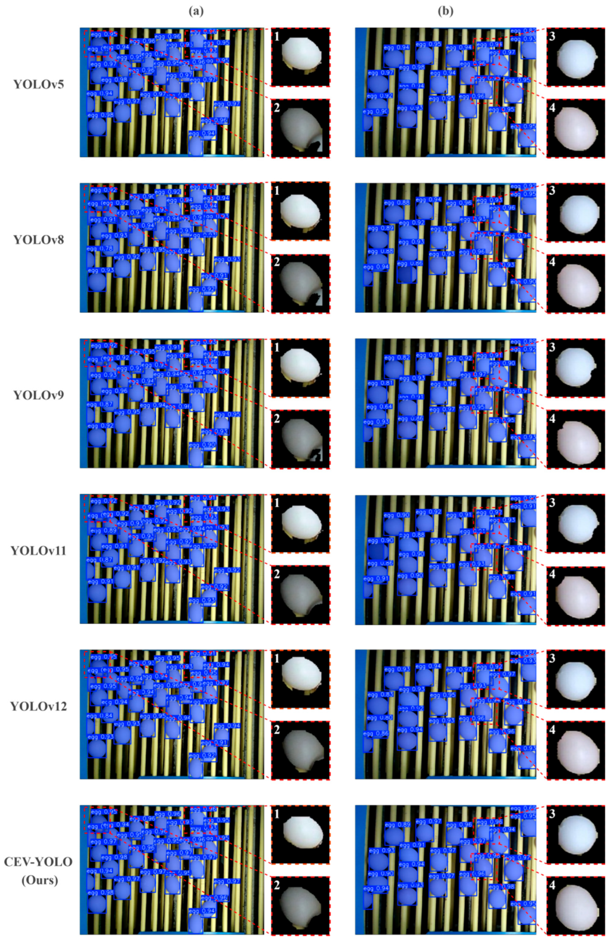 Table 7, the number of parameters, GFLOPs, and FPS of the proposed CEV-YOLO are 3.99, 11.8, and 39.4, respectively. In terms of running speed, our algorithm’s performance is slightly lower than that of YOLOv5 and YOLOv11 and is close to that of YOLOv12. However, CEV-YOLO has a significant advantage in segmentation accuracy (precision of 98.9%, recall of 97.5%, and AP90 of 89.8%). In general, our algorithm achieves a better balance between running speed and egg segmentation accuracy.