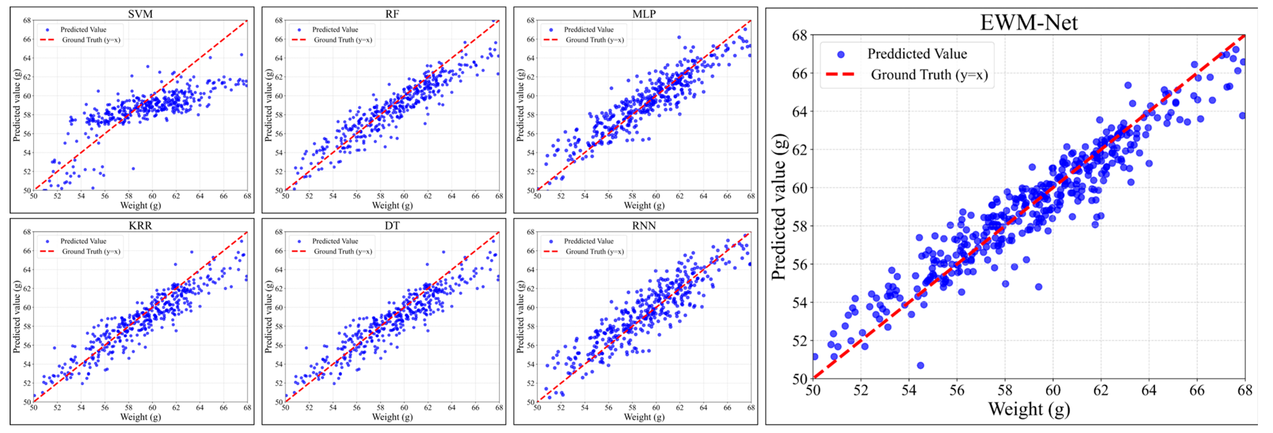 Figure 15 that the predicted weight values of EWM-Net are closer to the true value line (red dotted line) compared with other methods, demonstrating the robustness and accuracy of our model. Additionally, EWM-Net is the only model with an MAE of less than 1 g (0.88 g), the R
