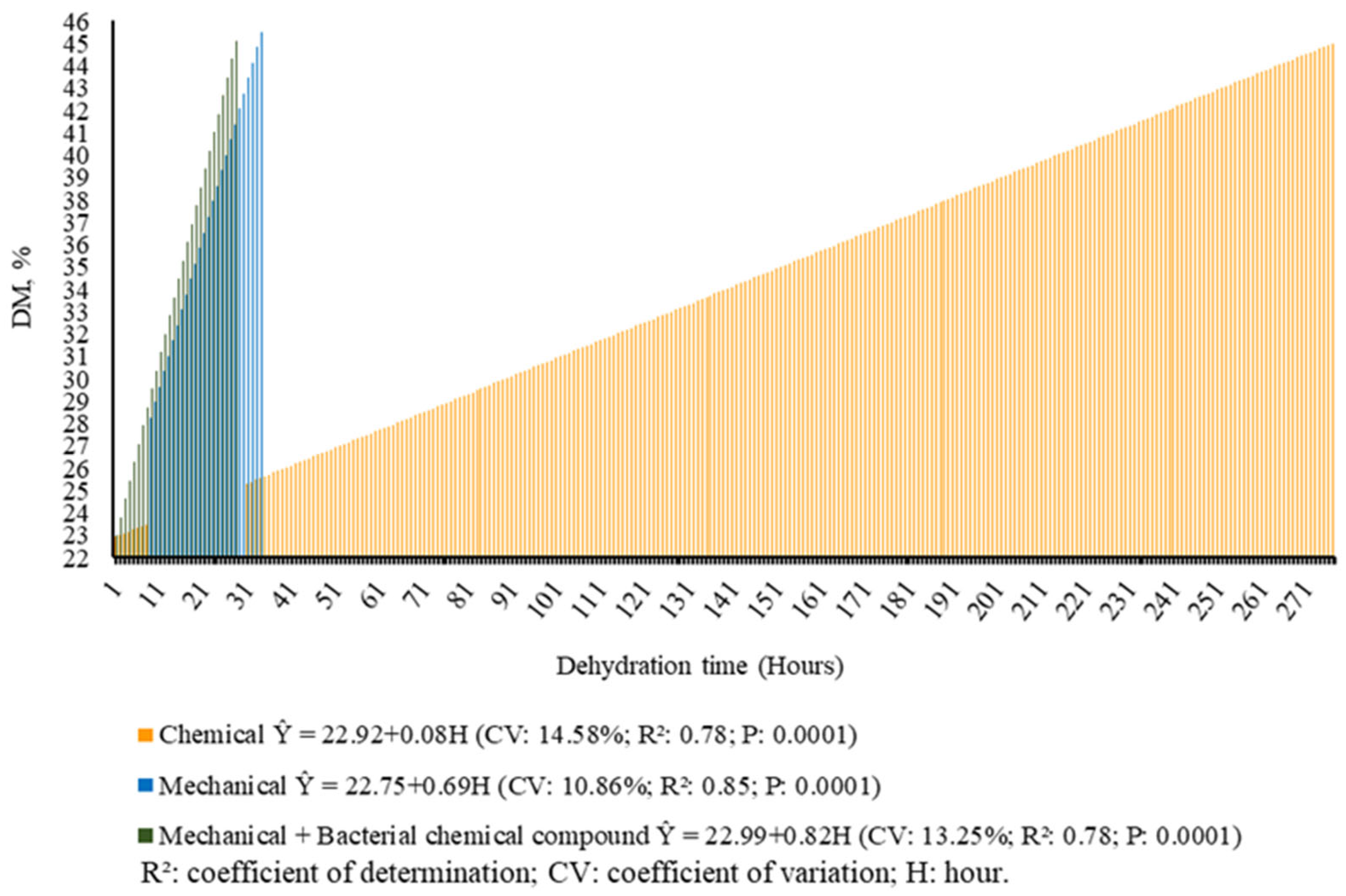 The rate of forage dehydration exhibited an increasing linear behavior across all dehydration methods (Figure 2). The MEC + BCC method was the most efficient, increasing the DM content by 0.82% h−1 (Green bars), followed by the MEC method, with 0.69% h−1 (Blue bars), and the CHE method, which increased the DM content by 0.08% h−1 (Orange bars).