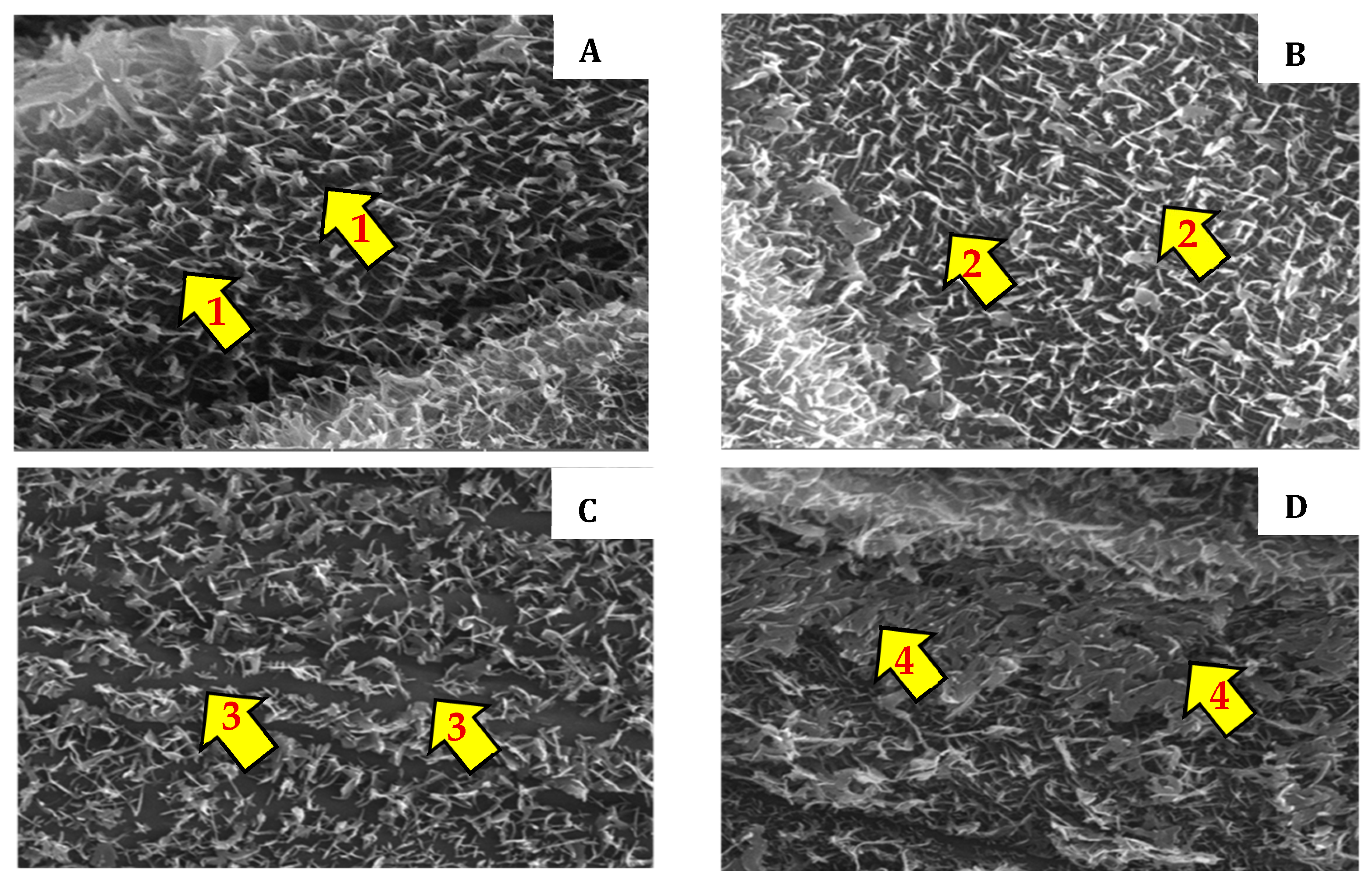 Figure 3A (arrow 1) illustrates the structure of the oat leaf cuticle at the tima of harvest (before the start of dehydration and before the application of any substance, be it glyphosate or the bacterial chemical compound evaluated). Larger cracks in the cuticular wax were observed in the leaves of plants dehydrated using the MEC + BCC method (Figure 3C, indicated by arrows 3) compared to the other dehydration methods (Figure 3B, arrows 2 and Figure 3D, arrows 4).