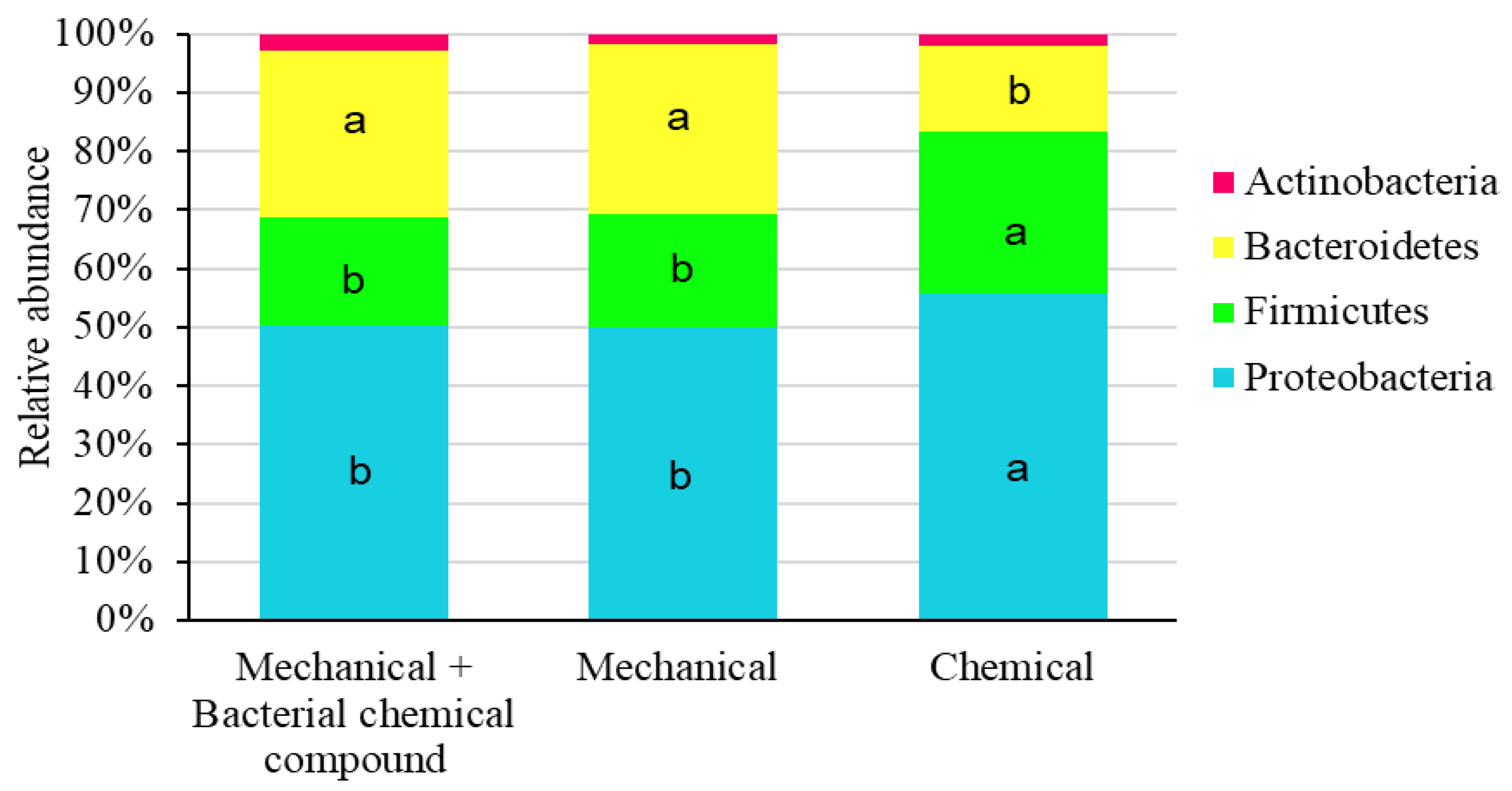 The lack of difference in microbial α-diversity between the haylages produced does not necessarily imply a similarity in microbial abundance, either at the Phylum or Genus level. Figure 4 illustrates the relative abundance of the identified bacterial phyla. Regardless of the haylage produced, Proteobacteria, Bacteroidetes, and Firmicutes were dominant. However, the haylage made from forage dehydrated with glyphosate presented a greater relative abundance of Proteobacteria and Firmicutes but a lower abundance of Bacteroidetes, compared to the others.