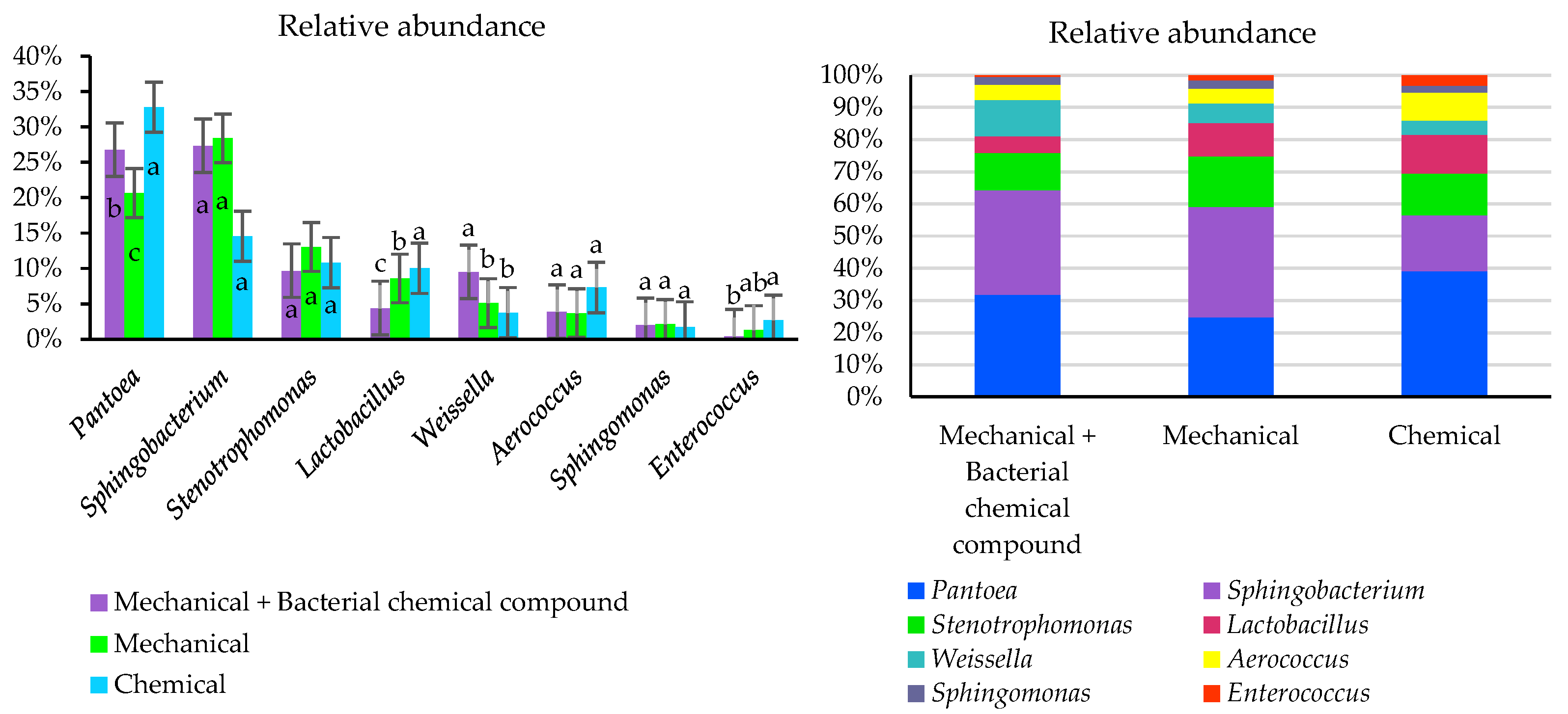 The Phylum Proteobacteria was composed of the genera Pantoea, Sphingomonas, and Stenotrophomonas. The Phylum Firmicutes comprised the genera Aerococcus, Enterococcus, Lactobacillus, and Weissella. The Phylum Bacteroidetes was constituted by the genus Sphingobacterium.