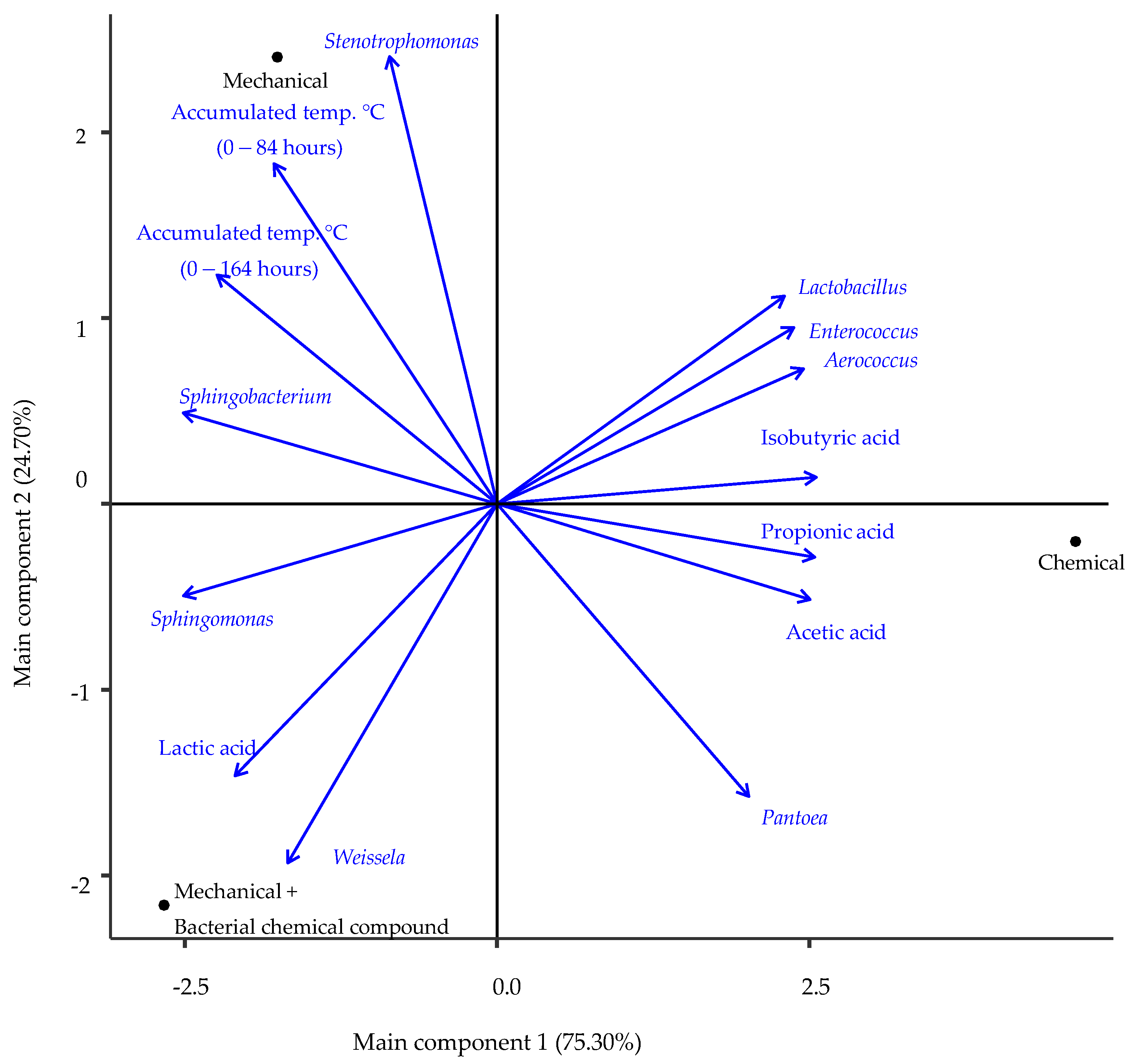 Figure 6. Main component analysis for fermentation parameters and main bacterial genera in white oat haylage made from forage subjected to three different dehydration methods.