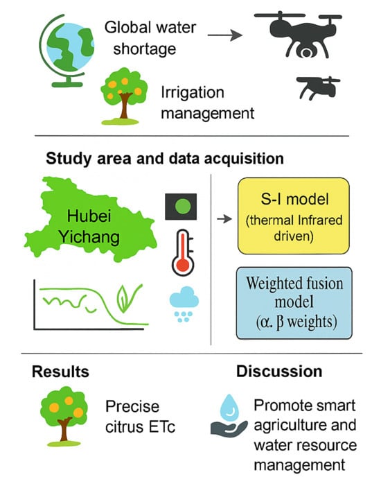 ETc estimation approaches to similar hilly agricultural areas. This study holds significant practical relevance for promoting water-saving irrigation in the hilly agricultural areas of western Hubei, improving regional agricultural water management, and expanding the methodological boundaries of UAV-based multi-source fusion models for smart agriculture. To further illustrate the overall research framework and workflow, a schematic diagram has been added as