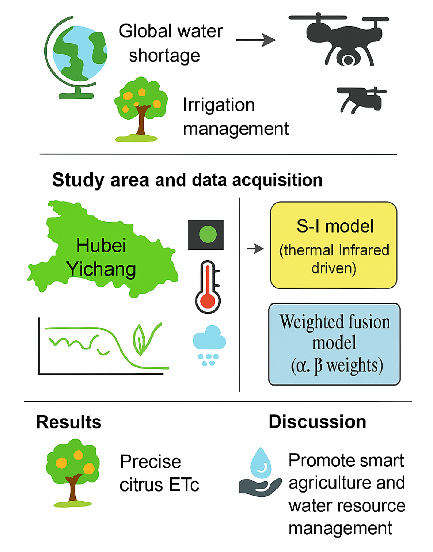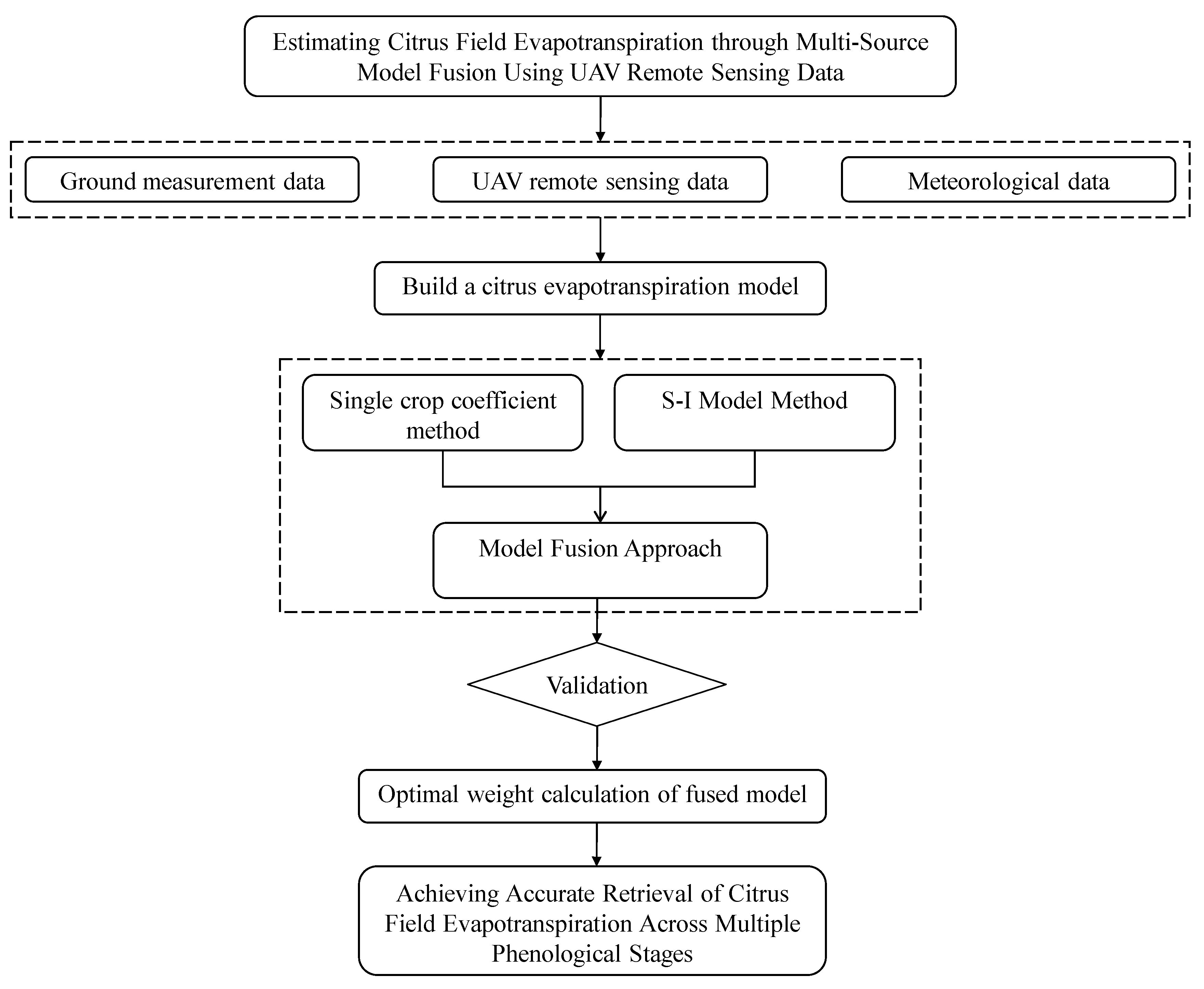 The value of this work lies in its integrated approach, combining UAV-acquired thermal and multispectral imagery with direct sap flow measurements throughout the growing season of citrus crops. The innovations of this study are threefold: (1) the development of a weighted fusion model driven by multispectral and thermal infrared data, integrating the single crop coefficient (