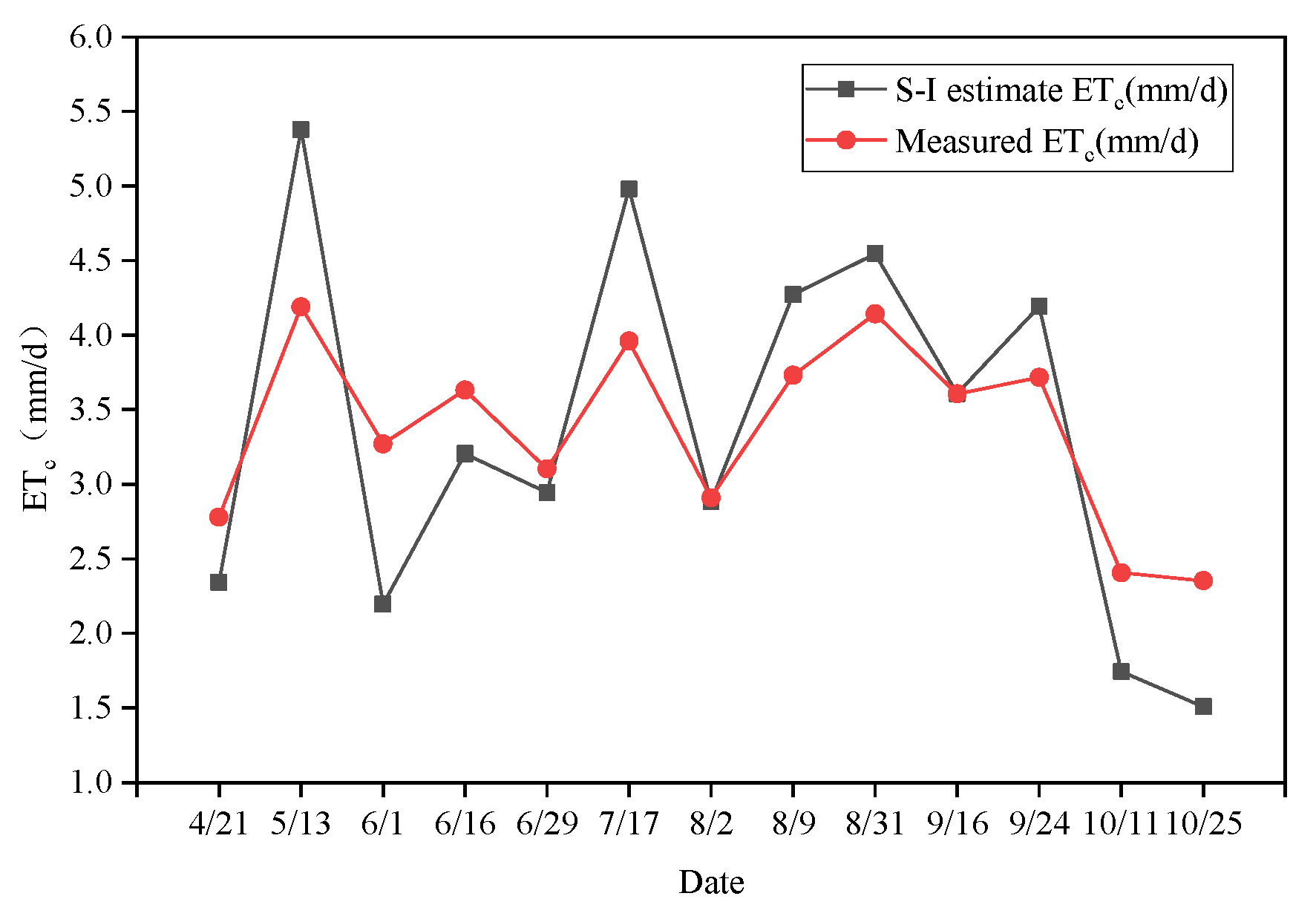 Figure 10 shows the variation in citrus daily evapotranspiration calculated using the single-crop coefficient model and measured by the sap flow meter. Except for a few extreme values, the overall trends of daily