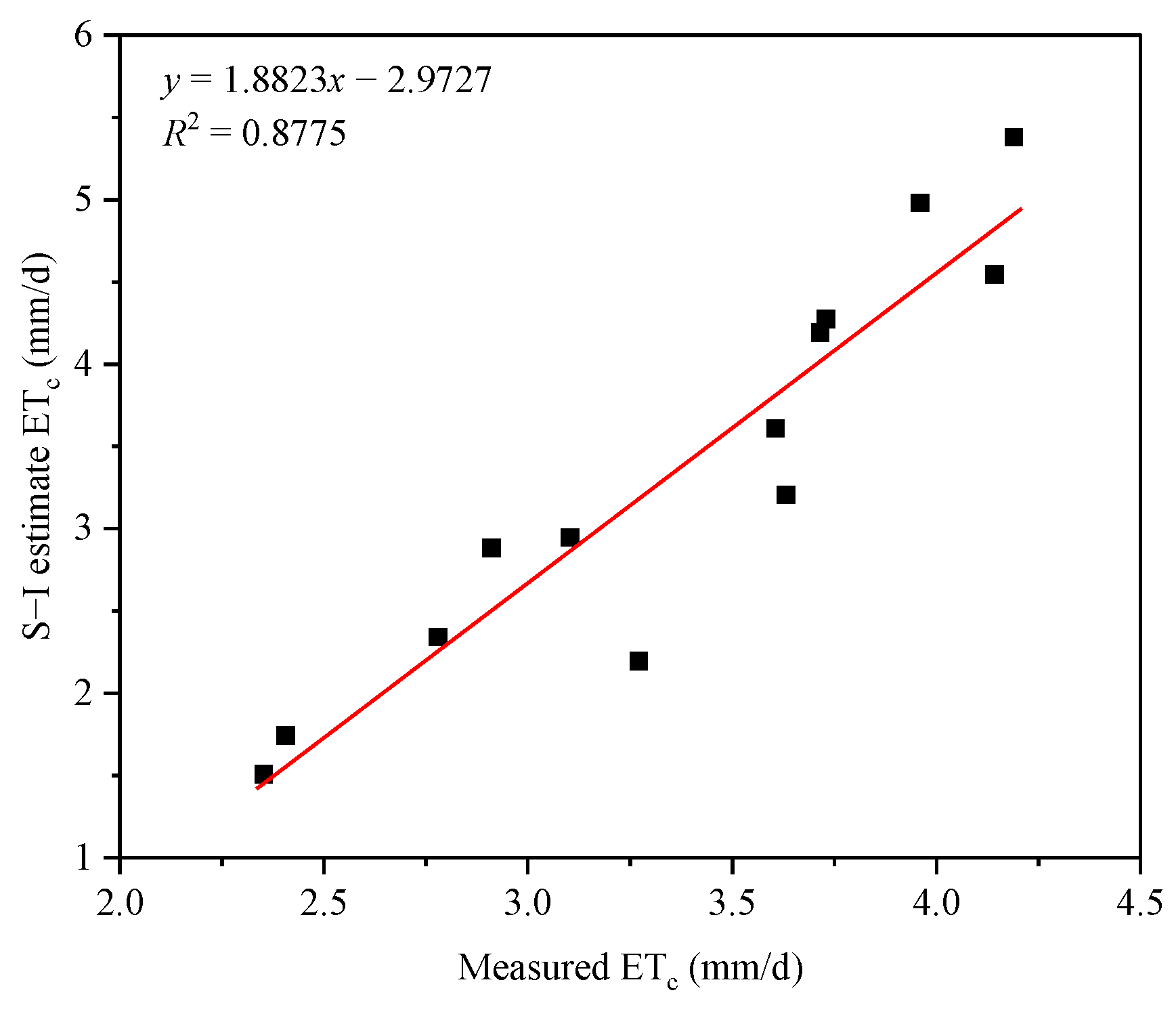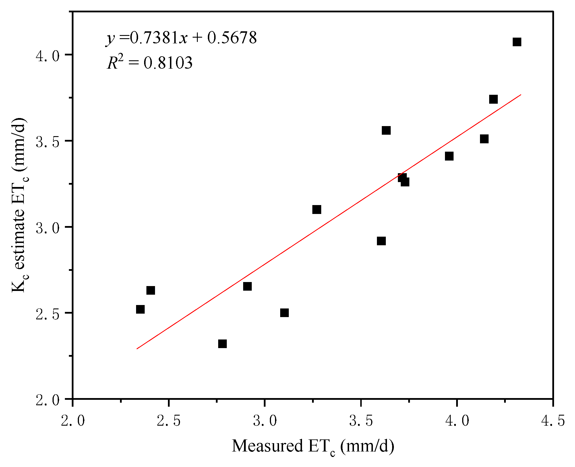 2) is 0.8103, the root mean square error (RMSE) is 0.4306 mm/d, and the mean absolute error (MAE) is 0.3867 mm/d. The relationship is significantly linear at