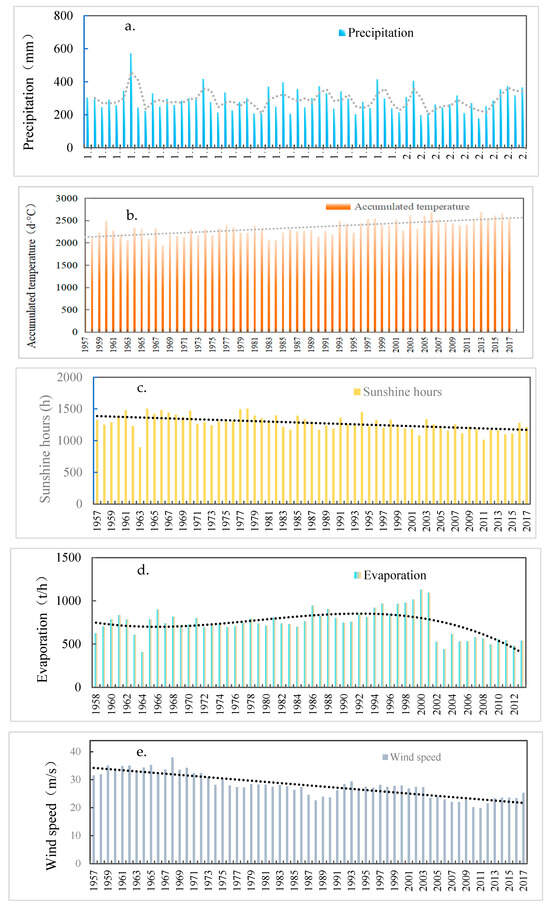Daily meteorological data for the period 1951–2017 were obtained from the National Meteorological Science Data Center (http://data.cma.cn/, accessed on 8 March 2025). The dataset included daily precipitation, mean temperature, sunshine hours, evaporation, humidity, wind speed, and other variables. Stations with significant missing records (>5%) were excluded from the analysis. Subsequently, the spatial distribution characteristics of key climatic variables were analyzed using the spatial analysis tools in ArcGIS.