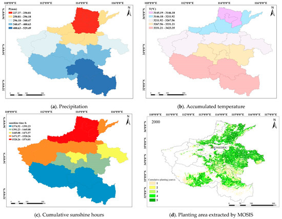 This study utilized remote sensing data acquired from the Moderate Resolution Imaging Spectroradiometer (MODIS) in conjunction with Geographic Information System (GIS) techniques to visualize the spatial distribution and continuous planting years of winter wheat in the study region. Multi-temporal MODIS imagery from the Google Earth Engine (GEE) platform was integrated with agricultural statistical data to extract the cumulative planted area of winter wheat in Henan Province from 2000 to 2012 (Figure 3d). Comparative analysis with the spatial distributions of climatic factors, specifically precipitation, accumulated temperature, and sunshine hours (Figure 3a–c), revealed a strong spatial concordance between winter wheat cultivation extent and climatic patterns. This alignment underscores the dominant role of climate conditions in shaping the spatial variability of winter wheat planting. These findings demonstrate the synergistic value of combining remote sensing and climate data for agricultural spatial analysis.