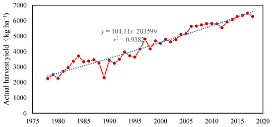 The temporal variation of the actual harvest yield of winter wheat in Henan Province from 1978 to 2018.