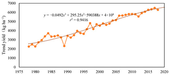 Selecting an appropriate method for separating trend yield and climate-driven yield is crucial for accurately analyzing crop production in relation to climatic characteristics. Based on established methodologies, this study applied a cubic polynomial function to fit the trend yield of winter wheat in Henan Province using yield data from 1978 to 2018. As shown in Figure 5, the fitted trend yield generally exhibited an upward trajectory over time and aligned closely with the actual yield in most years. However, the cubic polynomial method did not accurately capture yield fluctuations during the period 1987–1996, when actual yields first declined and then increased, indicating that this approach may not be fully suitable for our study. Refined decomposition of climate-induced yield is needed to improve fitting accuracy.