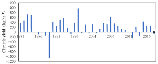 Figure 6 presents the climate yield, where positive and negative values indicate beneficial and adverse impacts of climate variations on winter wheat yield, respectively, while the magnitude of fluctuations reflects the extent of these impacts. The chart reveals that, prior to 2003, climate variability had a pronounced effect on yield, with a higher frequency of yield-reduction years. After 2003, the occurrence of negative climate yield values decreased noticeably. This shift can be attributed to continuous improvements in agricultural technologies, scientific innovations in farming practices, and enhanced expertise among farmers, which collectively have strengthened resilience to climate variability. It is also noteworthy that climate yield continues to exhibit considerable interannual variability, underscoring the severe impact of extreme weather events—such as droughts and floods—on winter wheat production.