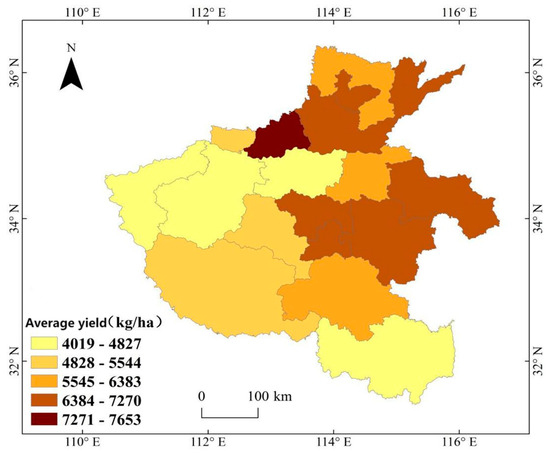 This study utilized the actual yield data of winter wheat in Henan Province from 1978 to 2018, with the average yield from 2009 to 2018 for each prefecture-level city serving as a representative value of the actual winter wheat yield in the study area. In this section, we employed collected and organized data, including statistical yearbooks and rural statistical yearbooks from various cities in the study area, to analyze and clarify the spatial distribution characteristics and temporal variation trends of the actual winter wheat yield from both spatial and temporal perspectives.
