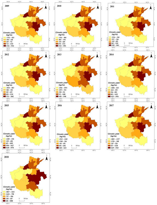 Figure 8 presents the spatial distribution of climate-driven yield anomalies for winter wheat across 18 prefecture-level cities in Henan Province from 2009 to 2018. The results indicate a relatively stable interannual variability in climate yield across the province. Although the humid climate in southern regions is generally conducive to wheat growth, excessive precipitation has frequently led to increased disease and pest pressures, as well as harvesting difficulties, thereby negatively affecting yield formation. However, because winter wheat is cultivated on a smaller scale in the south, the impact of climate-induced yield fluctuations there is less pronounced. In contrast, the larger cultivation areas in the north amplify climate-related risks.