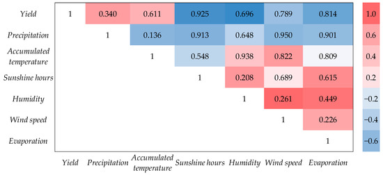Secondly, by integrating historical climate data with yield records for historical yield simulation analysis, we can thoroughly investigate the correlation between climate change and winter wheat yield, thereby elucidating the actual impact of climate variability on agricultural productivity. Thus, we further investigated the effects of key meteorological factors during the growing season—including precipitation, accumulated temperature, sunshine hours, humidity, wind speed, and evaporation—on winter wheat yield and analyzed their correlations, as illustrated in Figure 9. Using the Geodetector method, we also evaluated the interactive effects between pairs of these factors on climate-driven yield. The results reveal that for most factor pairs, the interaction effect exceeded the sum of their individual effects, indicating a non-linear enhancement. All six factors exhibited mutually reinforcing interactions, suggesting that synergistic amplification among meteorological drivers significantly enhances their individual impacts on climate yield. To achieve long-term yield stability, it is essential to account for the influence of climate factors and their variability when formulating region-specific irrigation, fertilization, and cultivation practices.