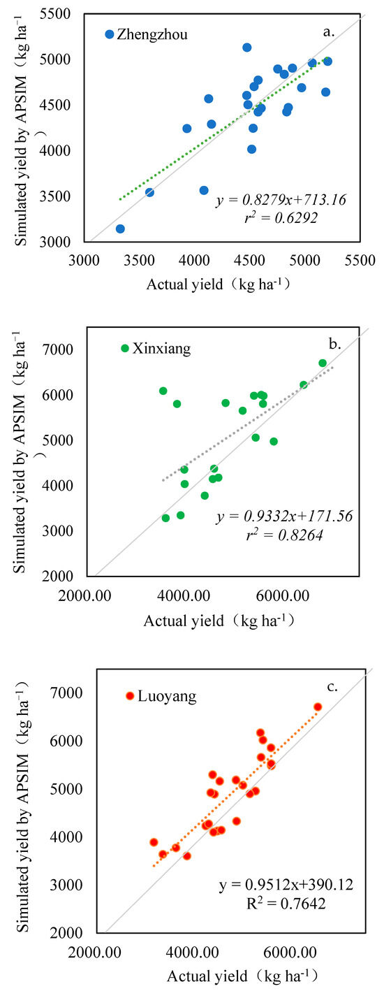 As shown in Figure 10a–c, under the SSP245 climate scenario, the APSIM model was able to explain more than 62.9%, 82.6%, and 76.4% of the observed variance in winter wheat yield in Zhengzhou, Xinxiang, and Luoyang, respectively, during the period 2013–2023. The simulated values showed good agreement with the observed data, with most data points distributed near the 1:1 line.