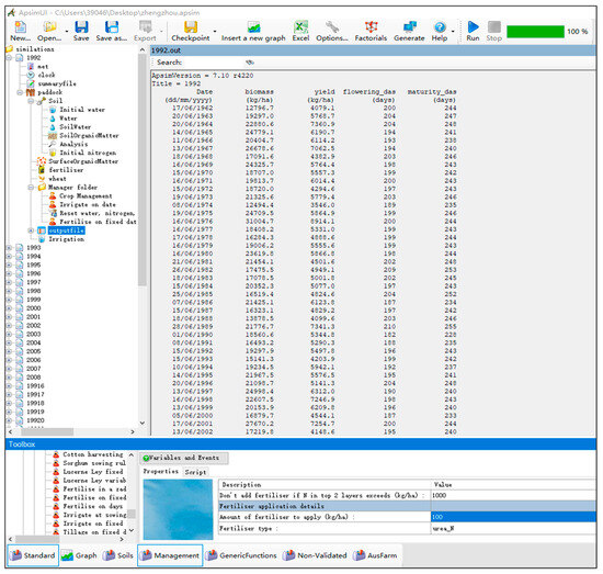 Utilizing meteorological, soil, irrigation, and fertilization data spanning from 1951 to 2017, an APSIM model was developed to simulate winter wheat growth in Henan Province, with the widely cultivated variety selected for simulation. Within the APSIM framework, cultivar-specific parameters governing winter wheat development are primarily classified into two functional categories: crop growth/development and yield formation. Key processes determining yield in the model include vernalization sensitivity, radiation use efficiency, dry matter partitioning, grain filling rate, potential grain number, and constraints imposed by water and nitrogen availability. For conciseness, only the parameters exerting substantial influence on winter wheat performance are presented; the major calibrated parameters are summarized in Table 1.