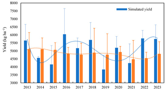 Comparison of actual vs. simulated yield in Zhengzhou of Henan Province from 2013 to 2023.