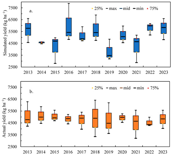 Changes of the simulated yield (a) and actual yield (b) in Zhengzhou over 2013–2023 under the climate scenarios SSP245.