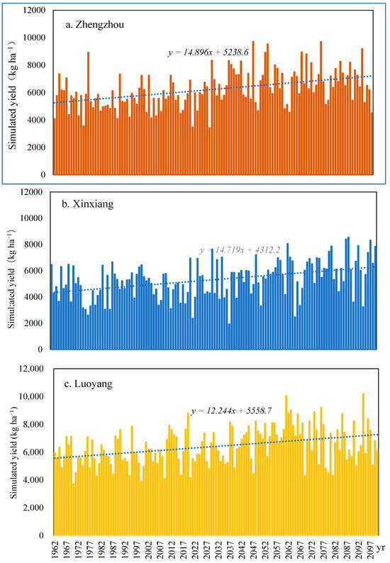 Simulation Results of Winter Wheat Yield under Future Climate Scenario SSP2-4.5 for Key Prefecture-level Cities ((a). Zhengzhoug; (b). Xinxiang; (c). Luoyang) in Henan Province, China (1962–2100).